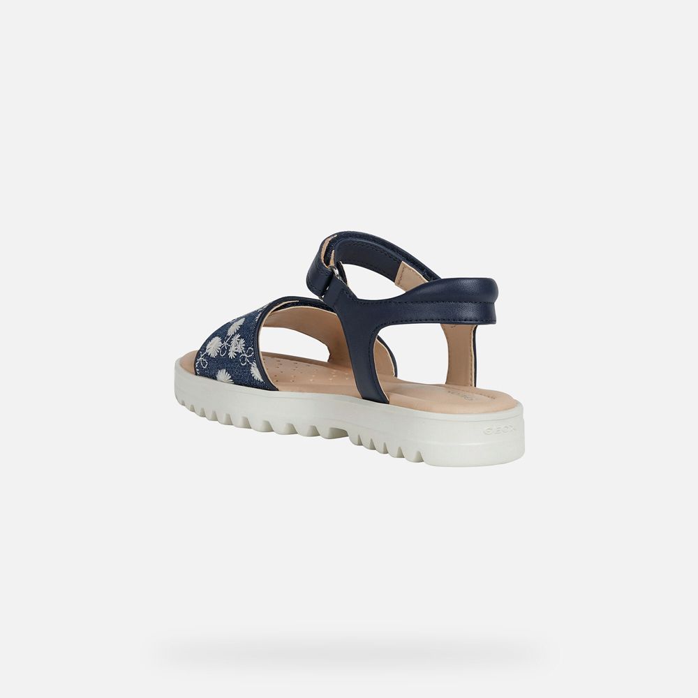 Geox's Coralie Girl is a demure feminine sandal featuring a navy-blue upper embellished with a romantic floral pattern; chic and easy to match, it is bound to appeal to littler girls. The double velcro strap fastening makes for an adjustable fit. The outsole comes in light EVA, meaning it is flexible and cushioning and provides the foot with support.