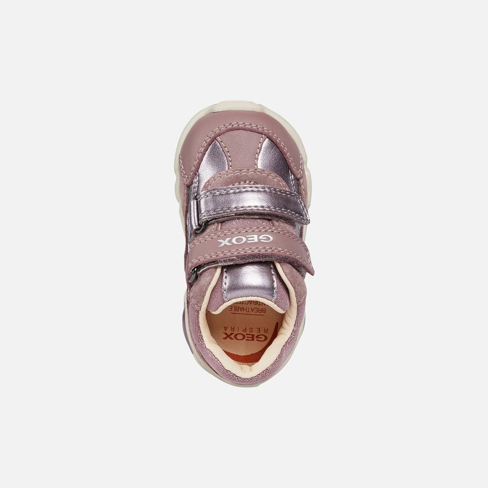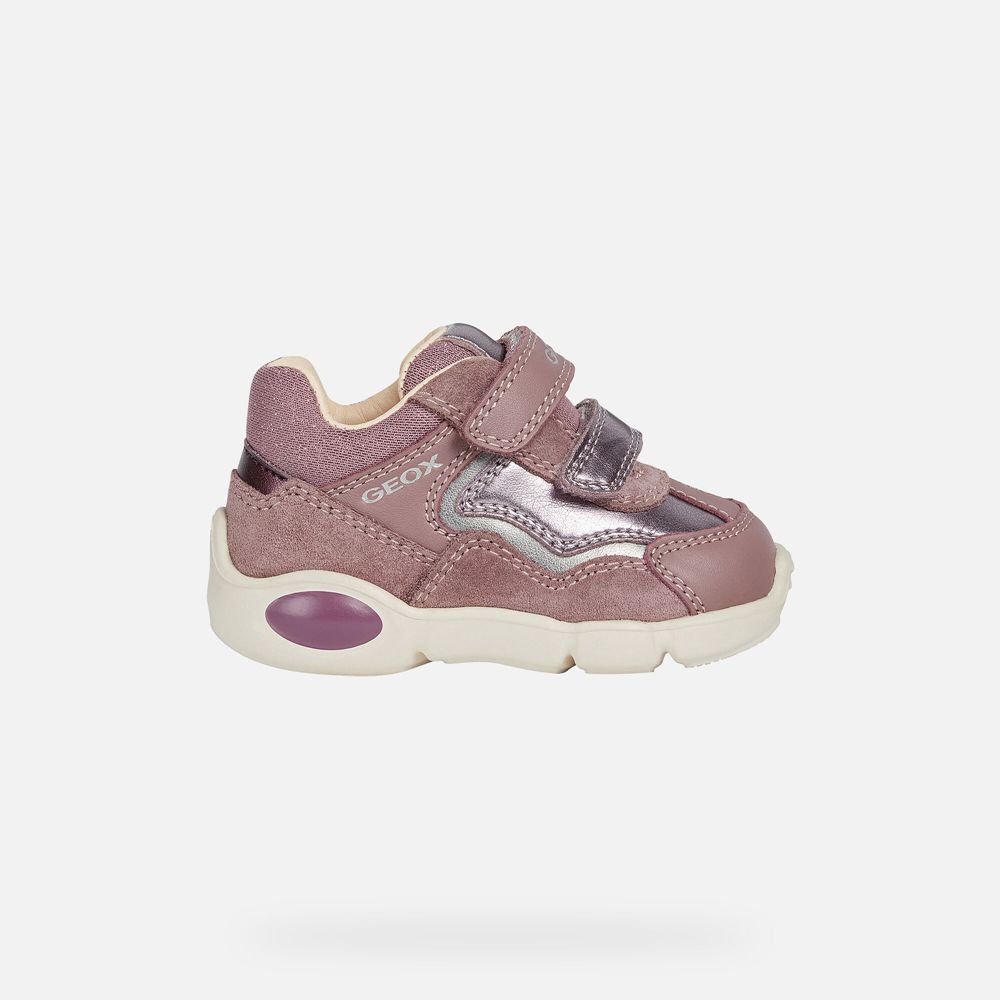 Pillow is the ideal ally for your little girl's first steps. Inspired by a running-shoe design, it has been crafted from suede leather and a pearlescent leather-effect material in a subtle pink palette with eye-catching silver details. It has been fitted with a double velcro strap fastening for a quick entry and an adjustable fit. The EVA outsole offers lightness, flexibility and a cushioning effect and has been made breathable by Geox's exclusive patented technology. The Flexy System tread provides this piece of footwear with flexibility while the outsole has been endowed with Zero-Shock PADS technology in the heel area for a proper cushioning effect. The removable footbed is practical and hygienic.